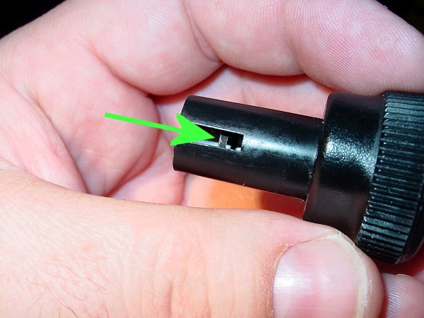 Insert a small screw driver into the slot and push the metal keeper to the rear of the car. It may be easier to hold the knob with your right hand and then push the release towards the rear of the car. There is not a lot of movement when you release the keeper, it is just a pressure fit.